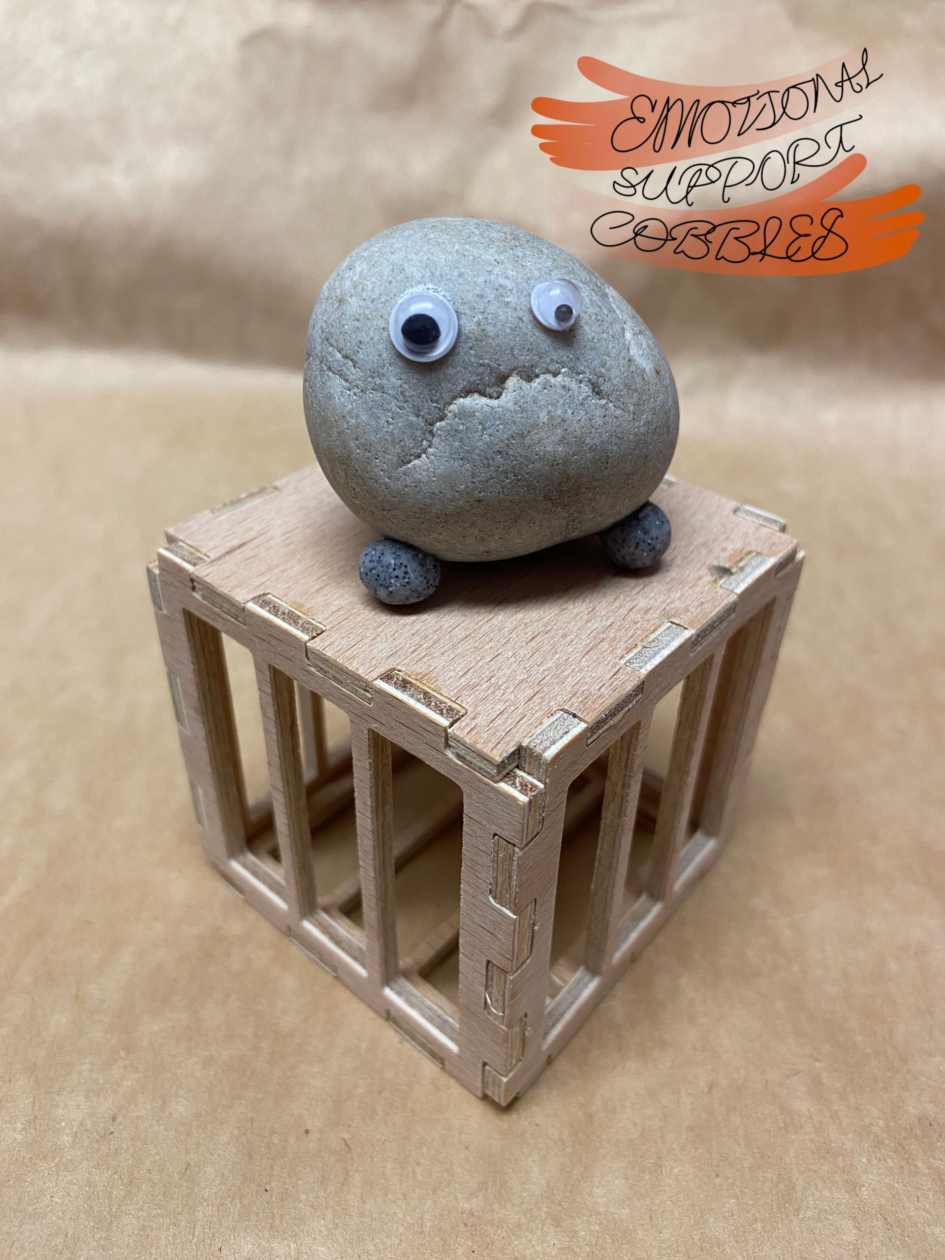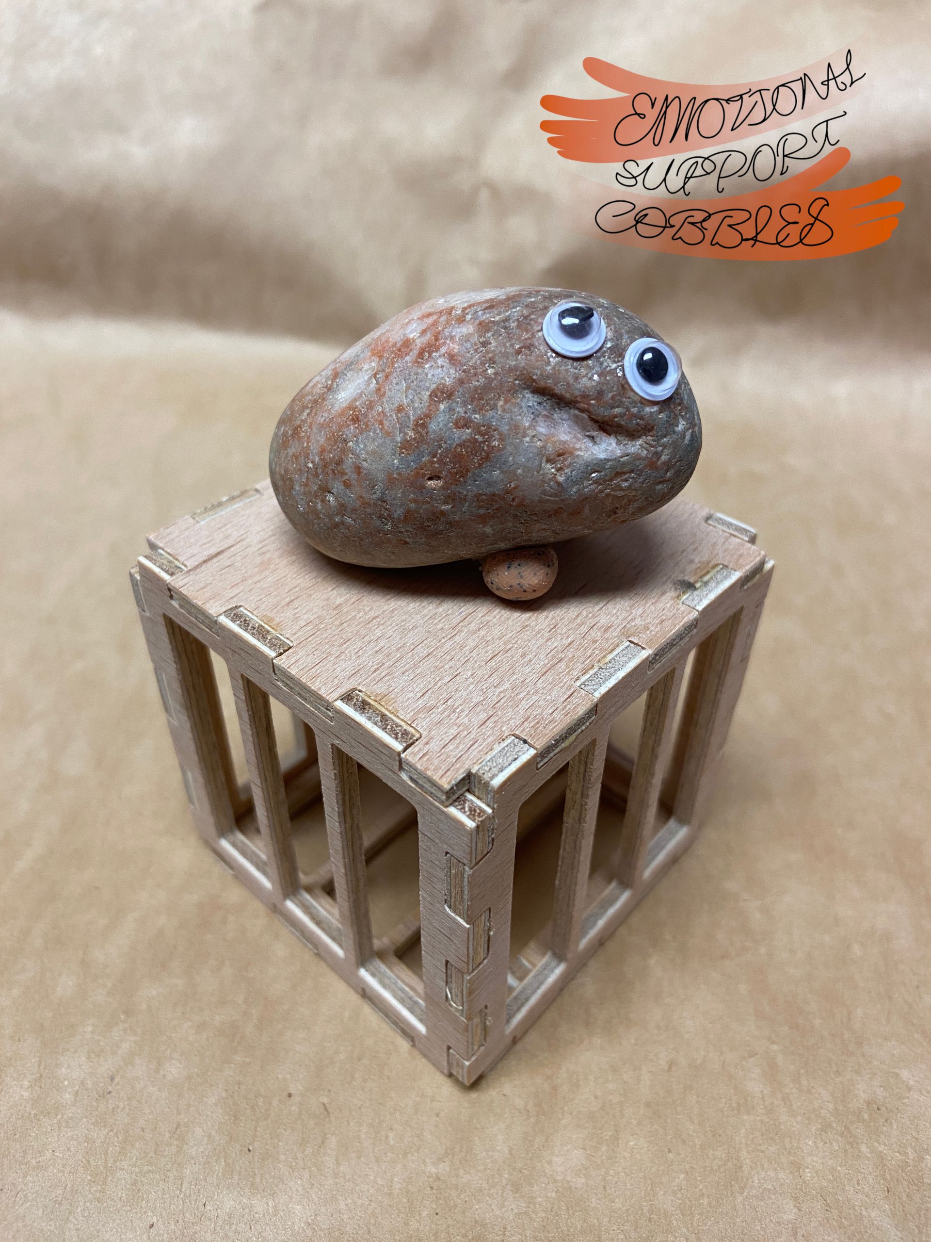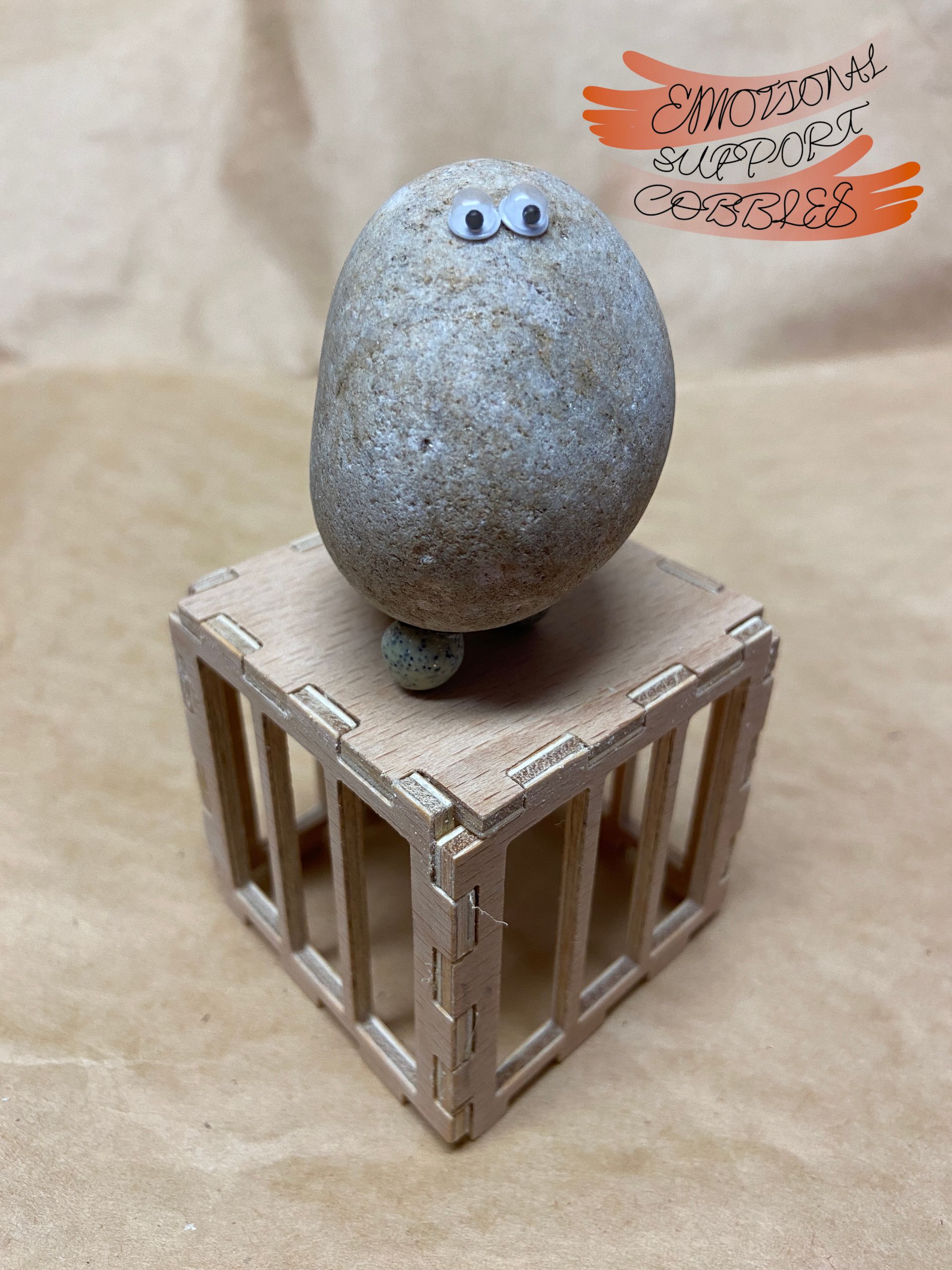 Each Emotional Support Cobble comes in it's own plywood crate with a removable top along with a carved name stick. Each Cobble is totally unique with their own expression and personality.