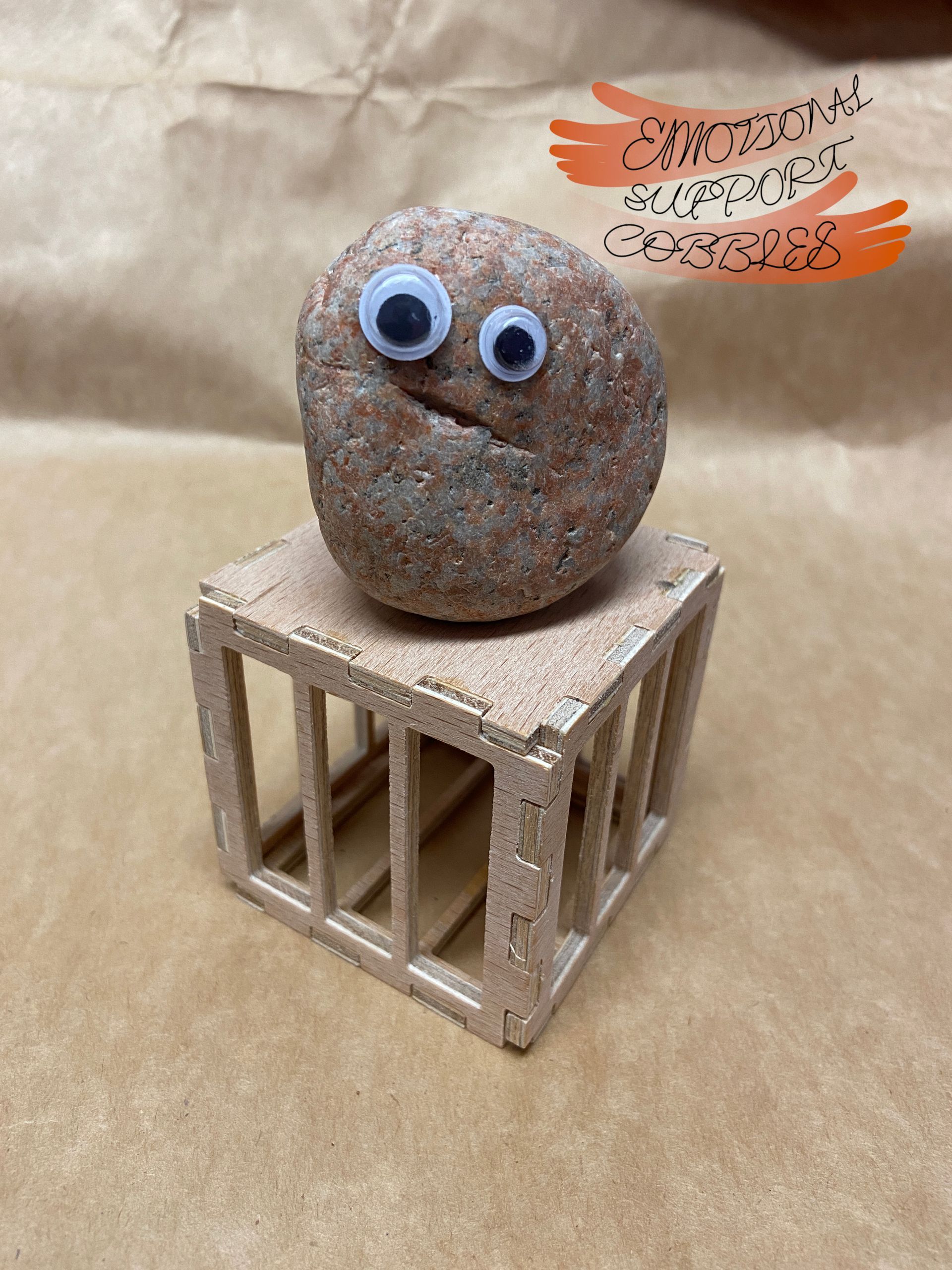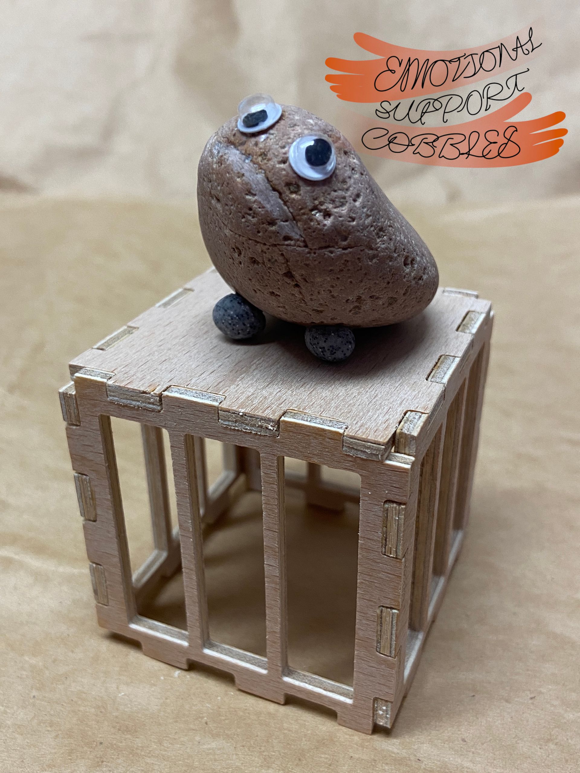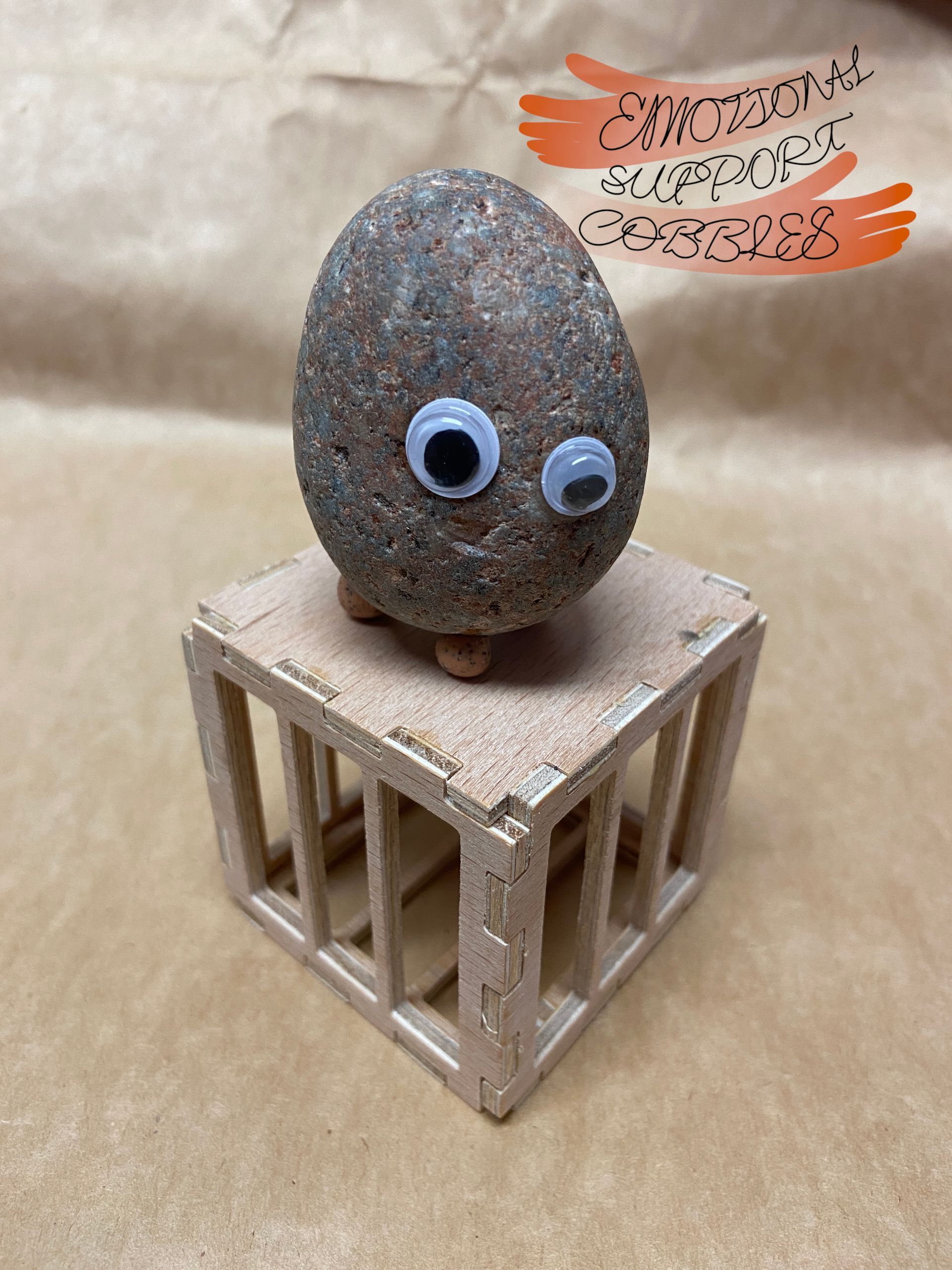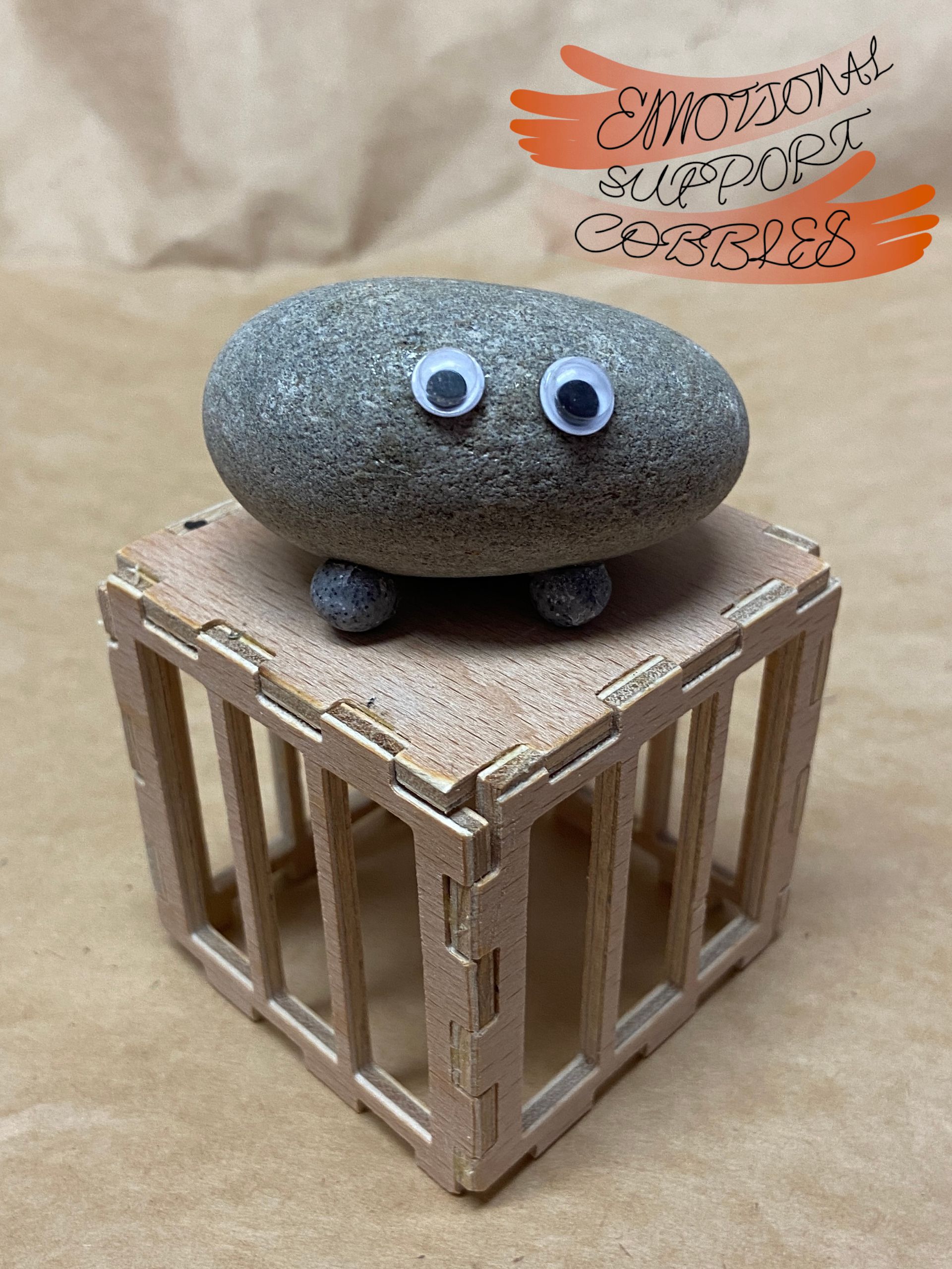 Each Emotional Support Cobble comes in it's own plywood crate with a removable top along with a carved name stick. Each Cobble is totally unique with their own expression and personality.